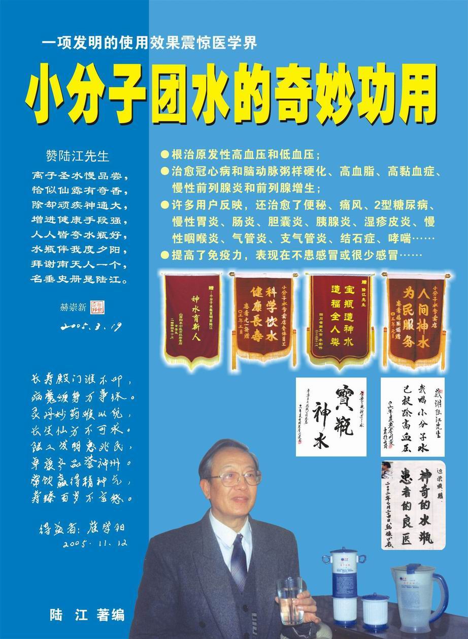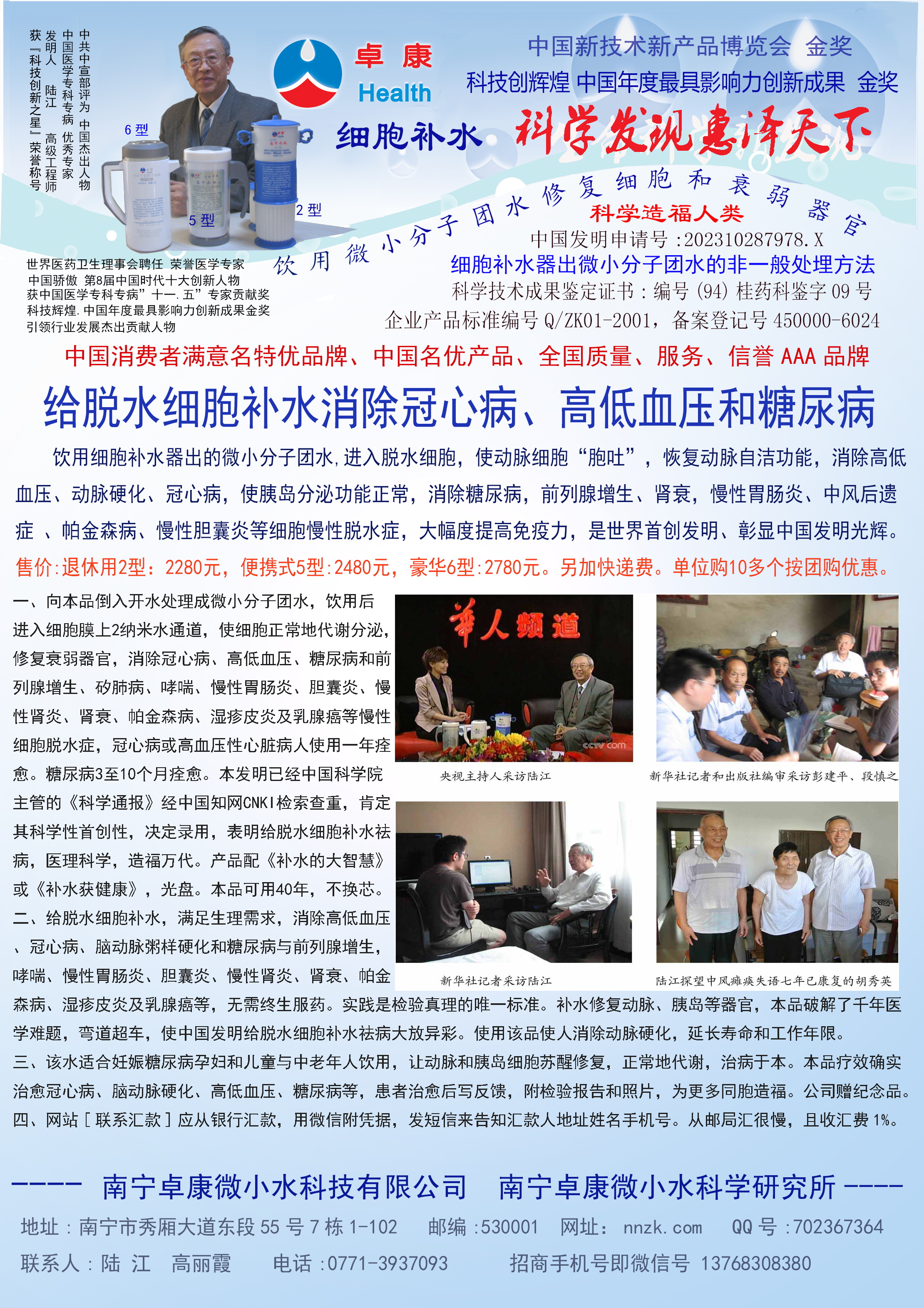 人類幾千年來患以上病癥需終生服藥,幾十年也不能治愈??墒俏覈蠈幍母呒壒こ處熽?nbsp;江,于1990年想根治高血壓,研究發(fā)明了離子水瓶,處理出微小分子團(tuán)水供飲用,經(jīng)過醫(yī)院臨床試用和專家鑒定,1999年獲中國發(fā)明專利權(quán),產(chǎn)品于2000年投放市場后一直跟蹤調(diào)查,據(jù)全國各地用戶反饋:祛除了高低血壓、糖尿病和冠心病,并使前列腺增生、咽喉炎、鼻竇炎、慢性氣管炎、支氣管炎、矽肺病、哮喘、慢性胃炎、腸炎、慢性膽囊炎、慢性腎炎、腎衰、膀胱炎、便秘、痔瘡、風(fēng)濕性關(guān)節(jié)炎和濕疹皮炎及中風(fēng)后遺癥等病癥不藥而愈。為什么喝微小水能治20多種病?陸 江從1991年德國科學(xué)家發(fā)現(xiàn)細(xì)胞膜水通道僅為2納米獲得啟發(fā),認(rèn)為多種器官患病是因細(xì)胞脫水,不能正常代謝和分裂增殖,才使器官細(xì)胞減少致衰弱萎縮而形成細(xì)胞缺水性病癥。22年來的實(shí)踐有力地支持了“細(xì)胞脫水致病”這一重要論點(diǎn),表明喝微小水可滿足細(xì)胞的生理需求,補(bǔ)水就能祛病,是生命科學(xué)新亮點(diǎn)。